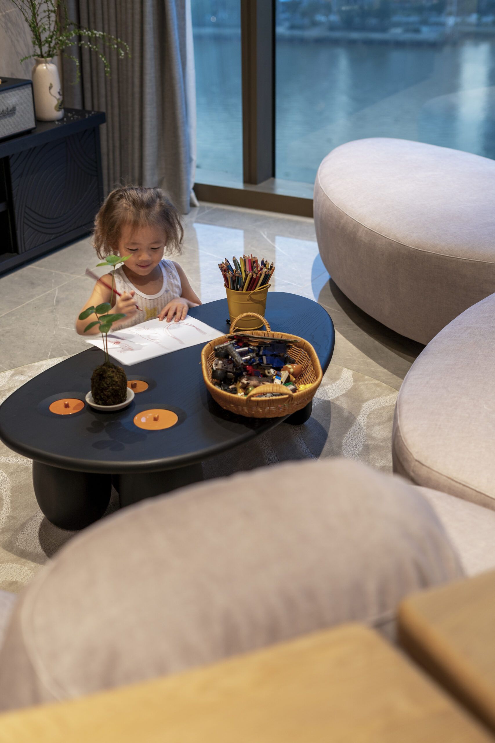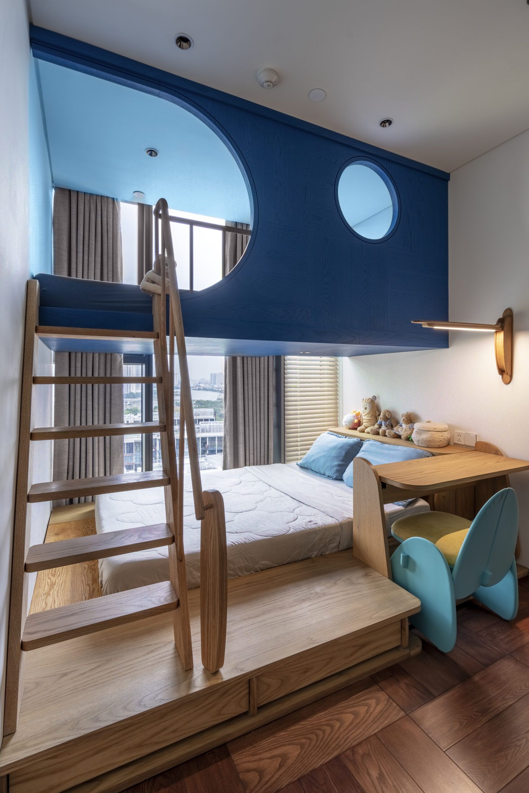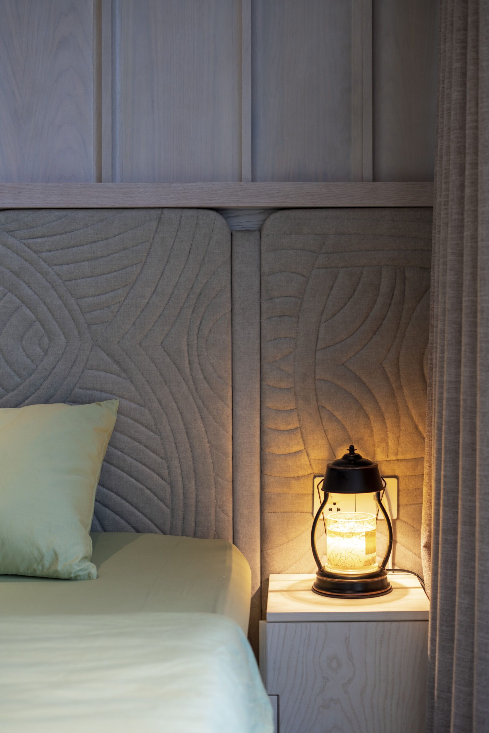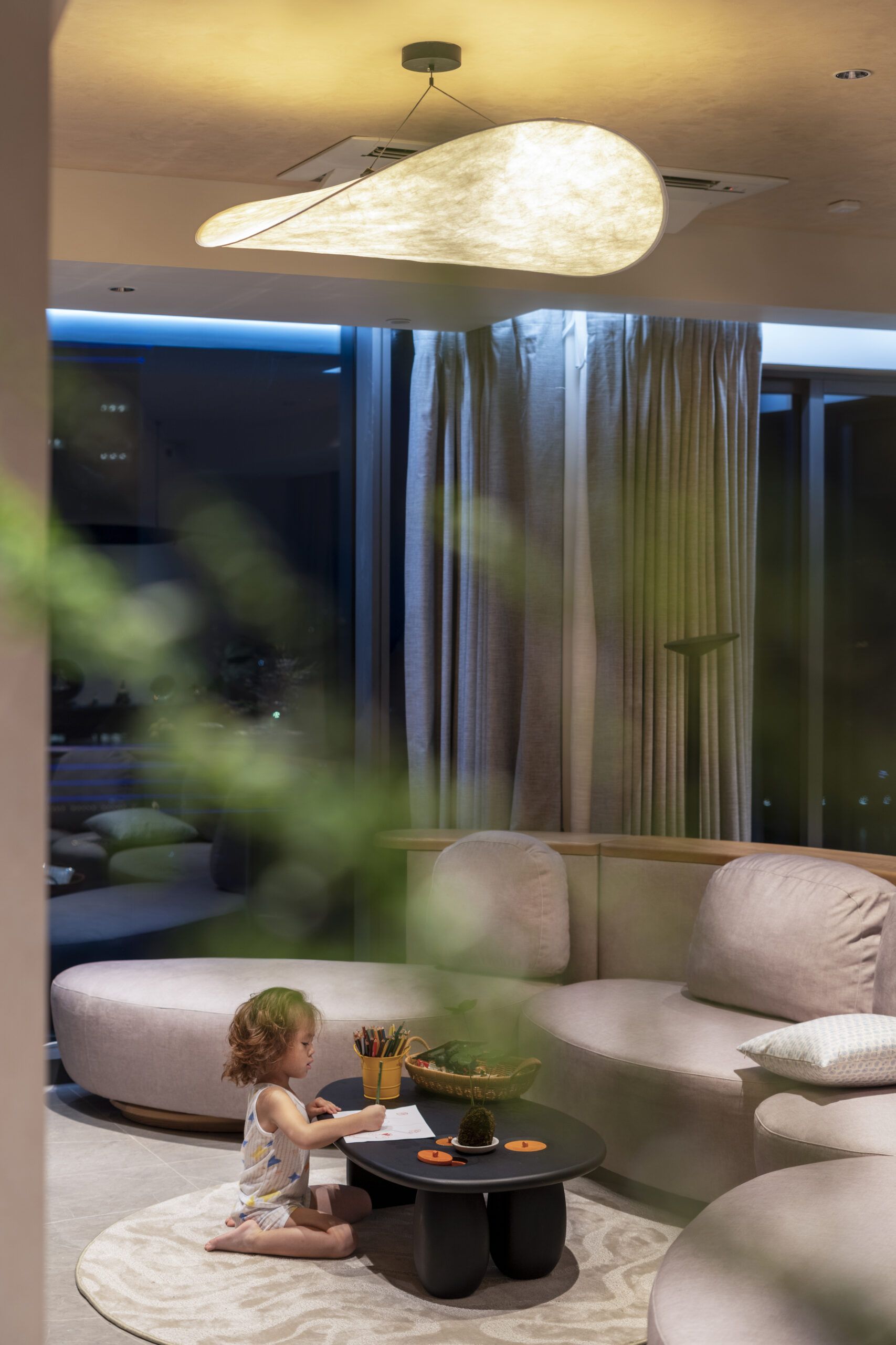 Our work is imbued with artistry, featuring bespoke lighting designs inspired by the moon. The centerpiece of the living room—a crescent moon chandelier—symbolizes transformation and unending creativity. In the children’s bedroom, a full moon wall lamp embodies completeness and tranquility, while the master bedroom is adorned with meticulously crafted stone-effect bedside lamps, bringing a natural yet luxurious touch to the space.