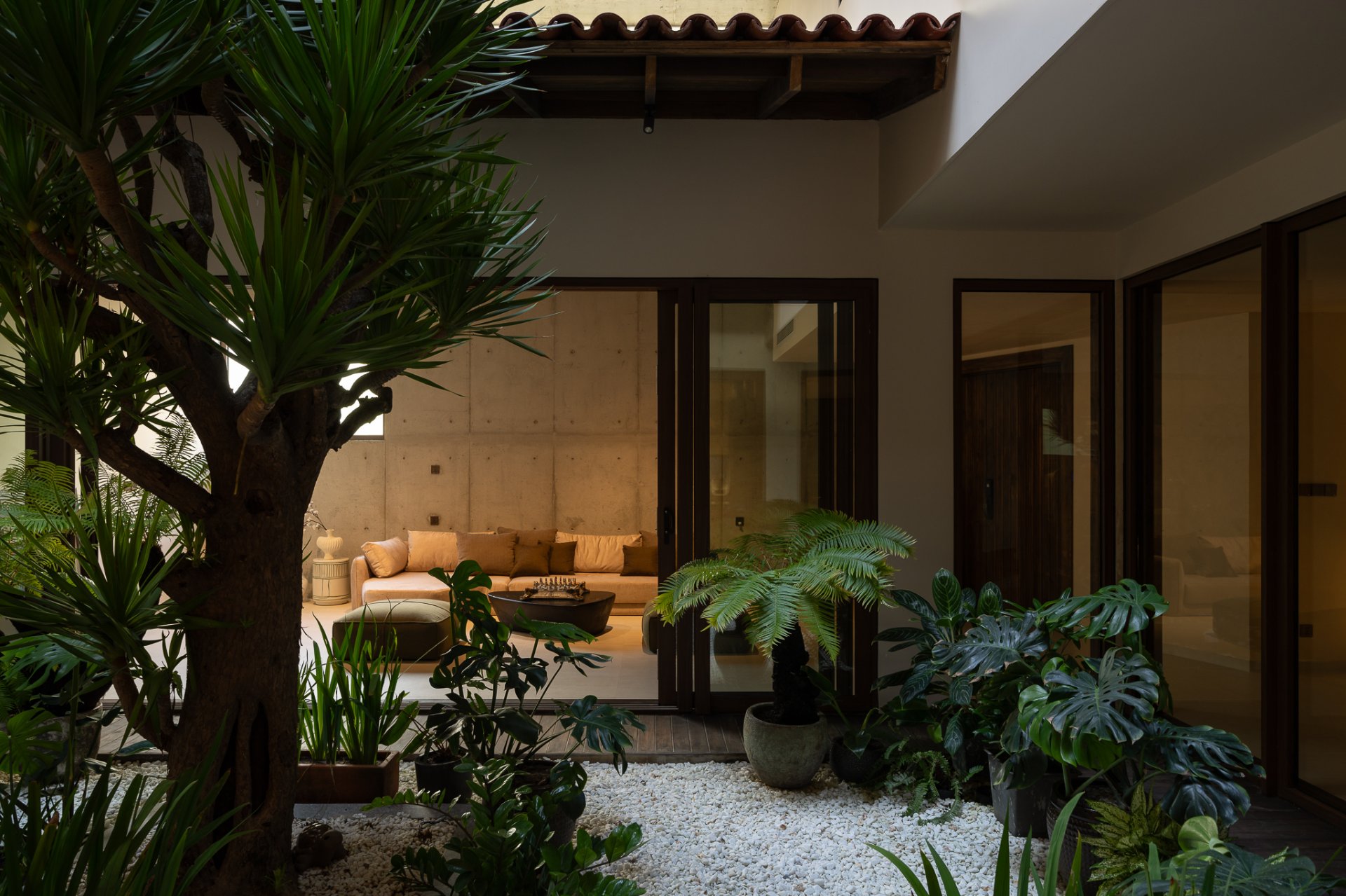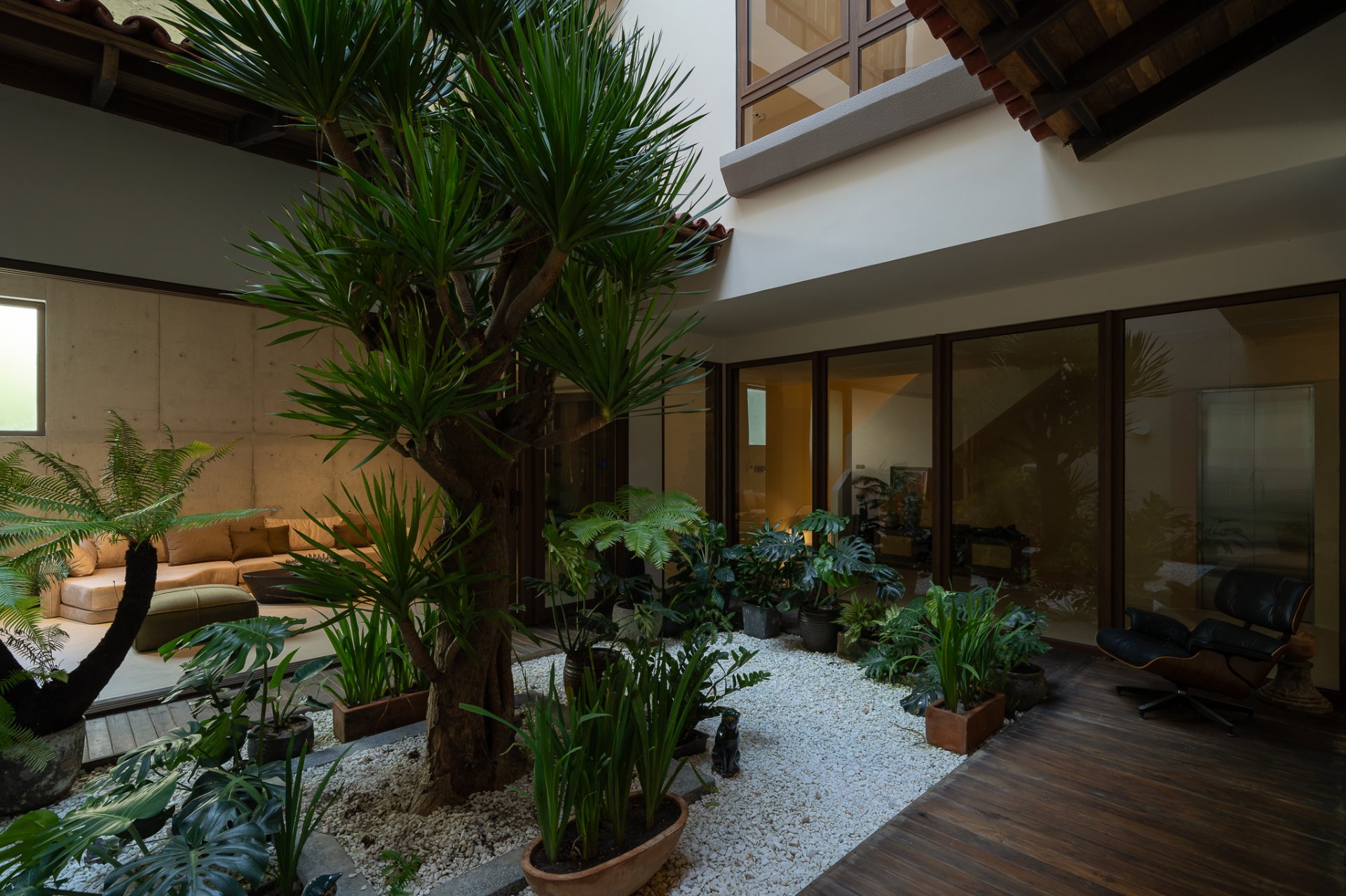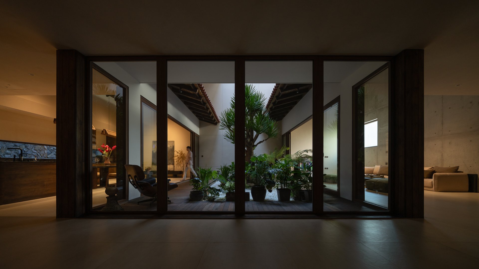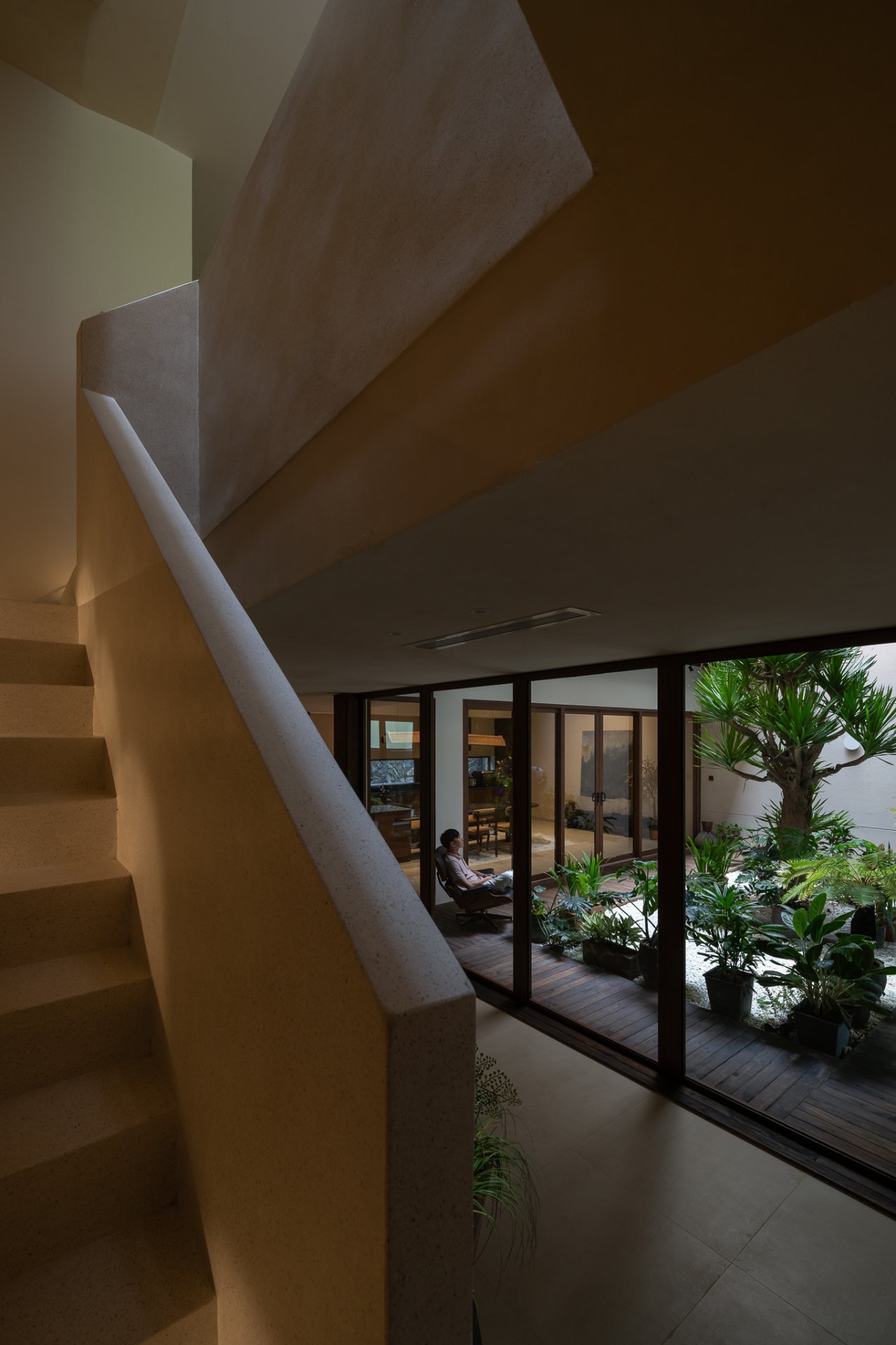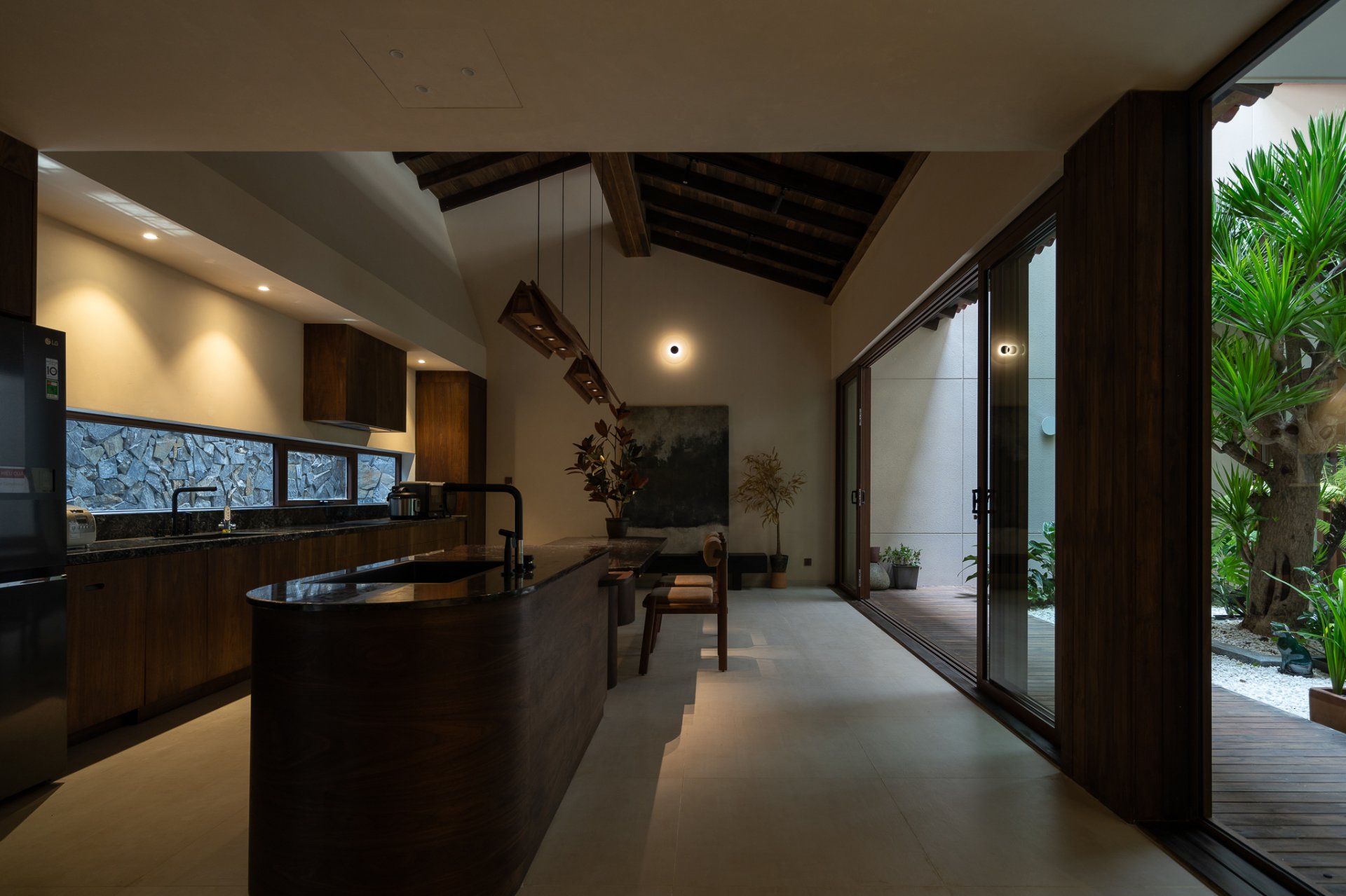 Cấu trúc của ngôi nhà được thiết kế với các lớp vỏ bọc chức năng và giếng trời, giúp cân bằng ánh sáng, thông gió và tạo ra sự liên kết giữa các không gian. Ánh sáng tự nhiên và hệ thống đèn của LYK phối hợp hài hòa, mang đến một môi trường sống đầy đủ ánh sáng nhưng vẫn đảm bảo sự riêng tư cần thiết.