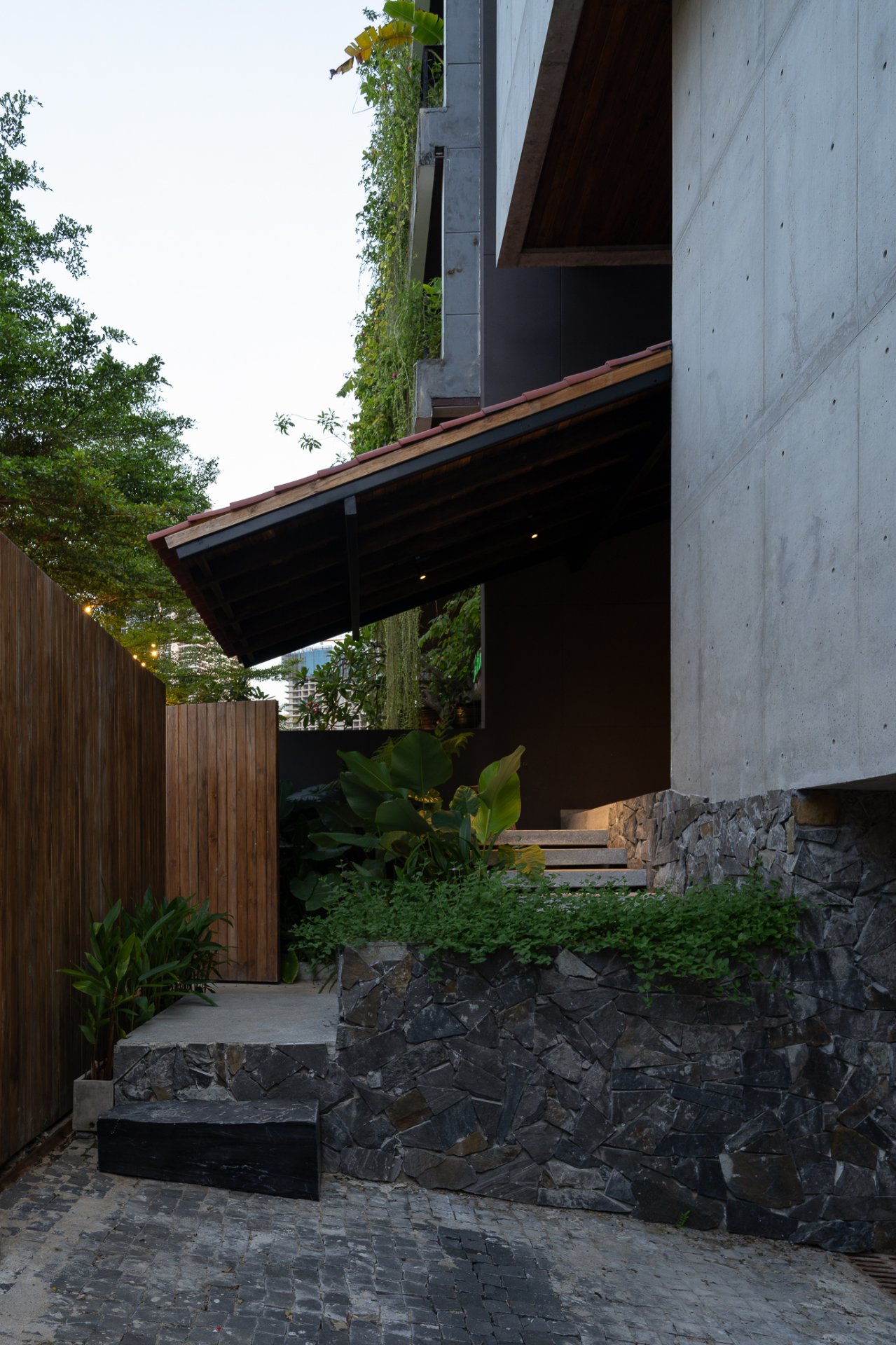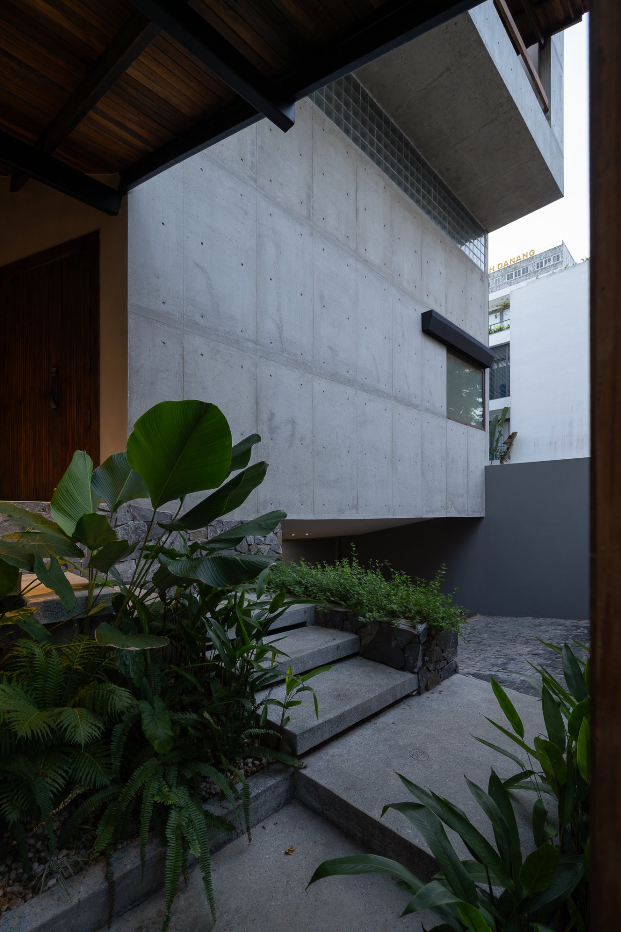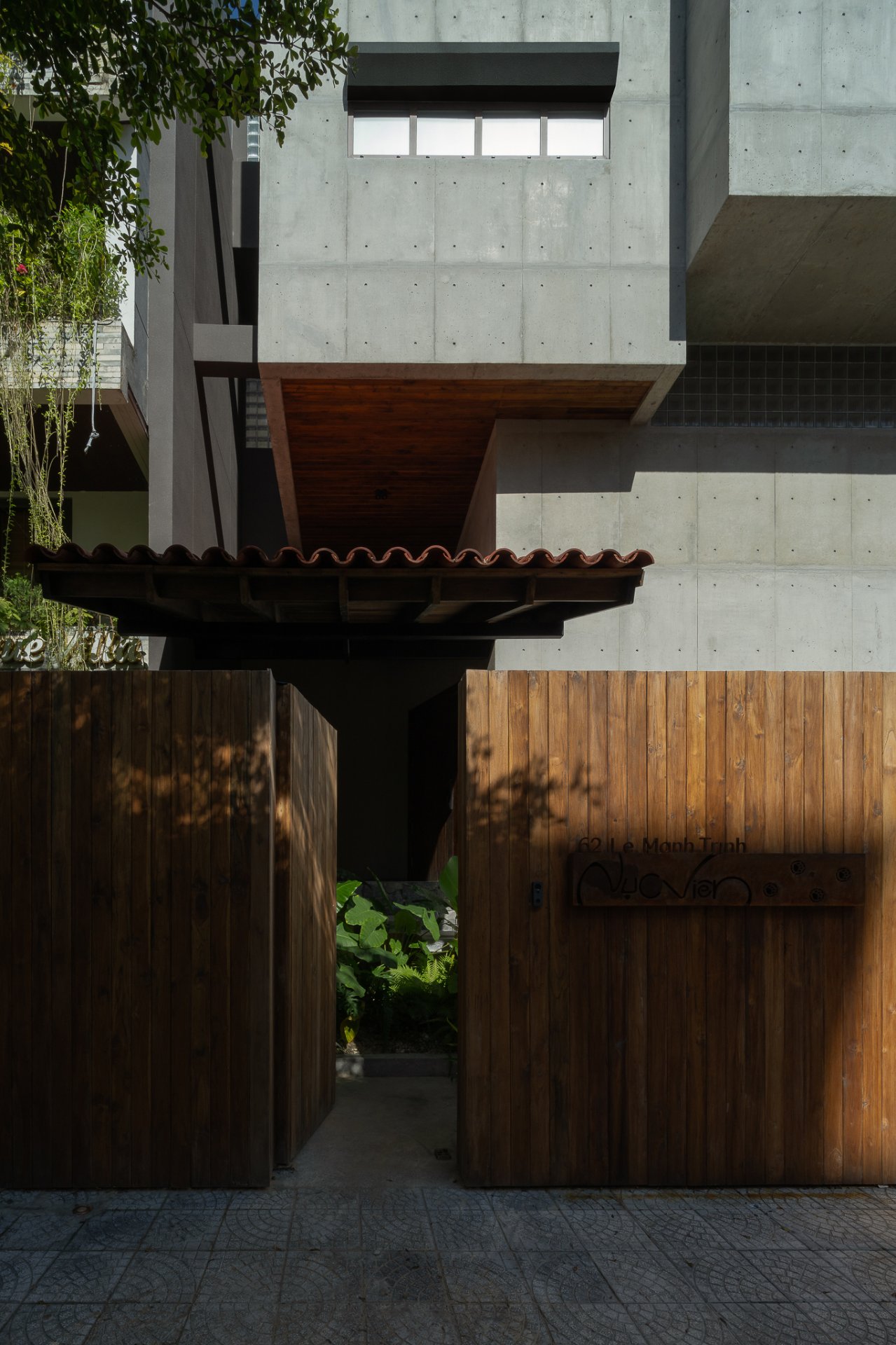 AD9 Architects cũng đã kết hợp rất tinh tế giữa các mảng bê tông thô theo phương đứng và hệ mái với cấu trúc vì kèo gỗ lợp ngói không chỉ giúp che chắn mà còn tạo nên sự hòa quyện giữa kiến trúc hiện đại và truyền thống. Đây chính là biểu hiện mạnh mẽ cho sự hài hòa và cân đối trong thiết kế kiến trúc, giúp không gian sống thêm phần ấm cúng, sum họp và hạnh phúc dưới Nục Viên.