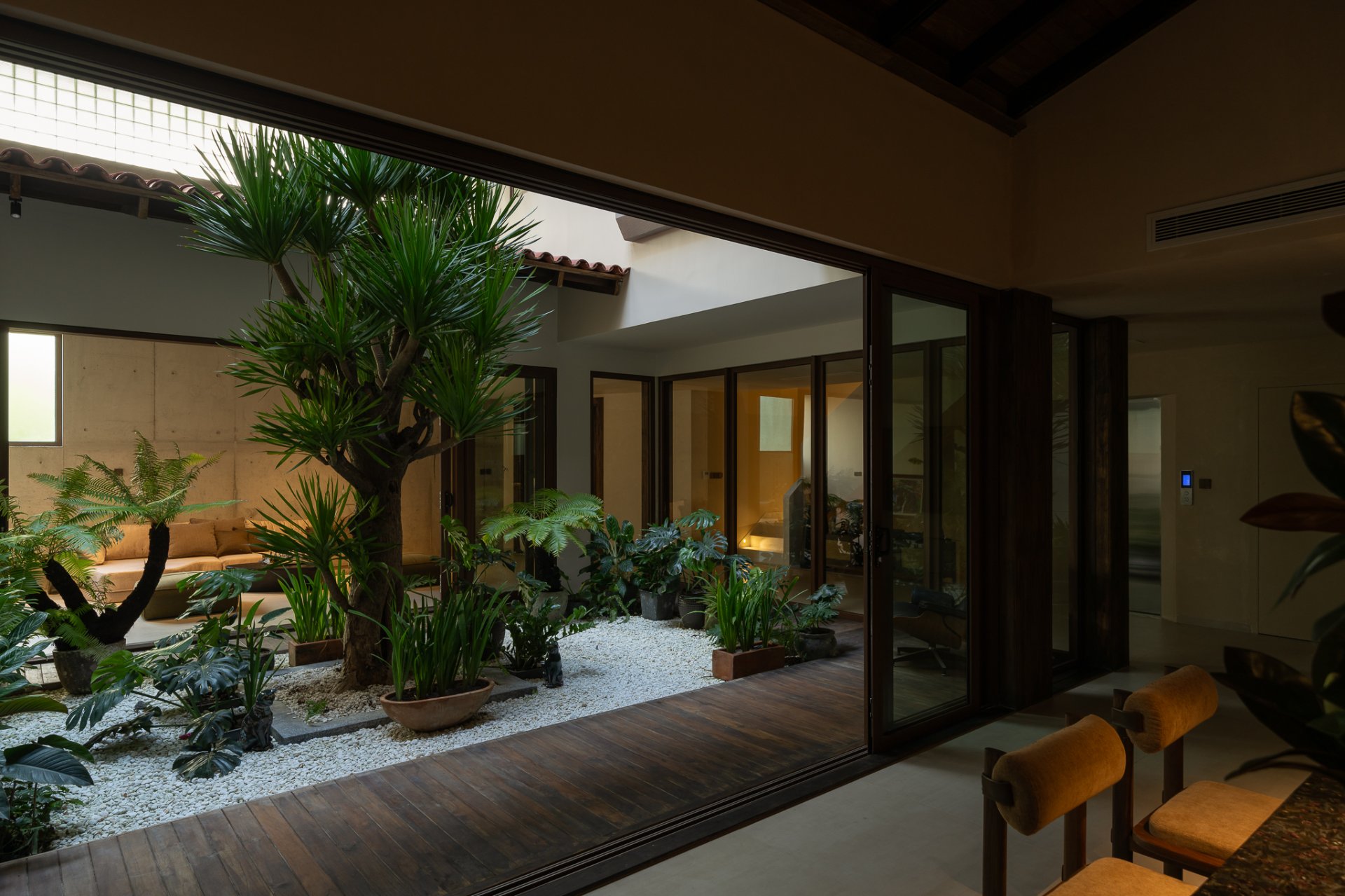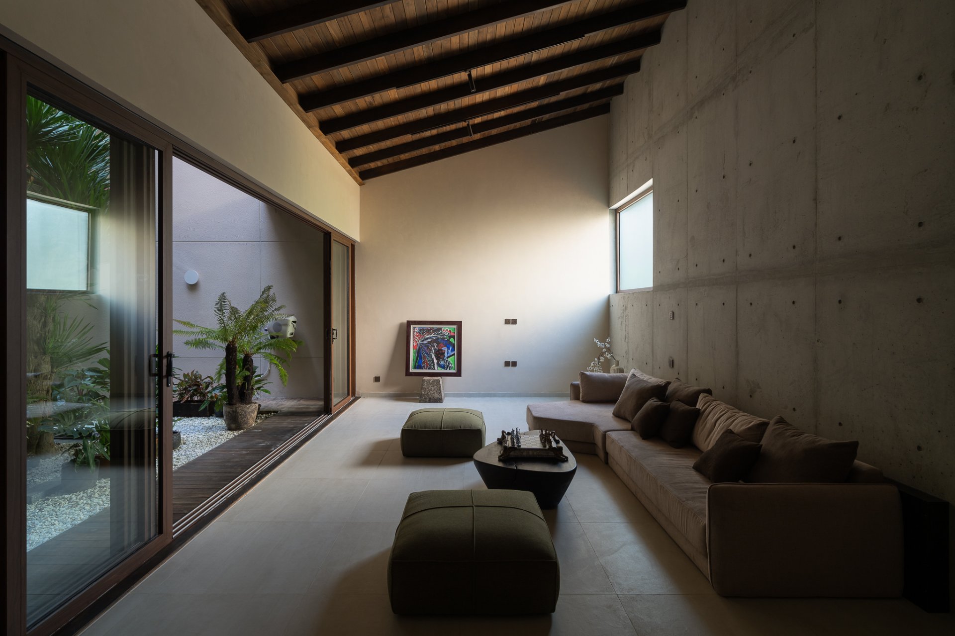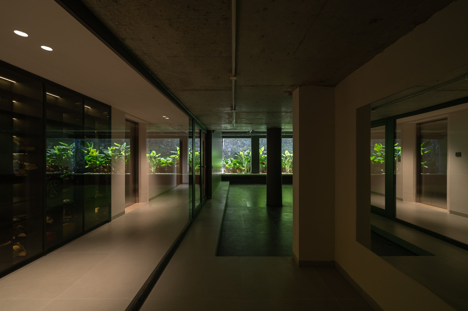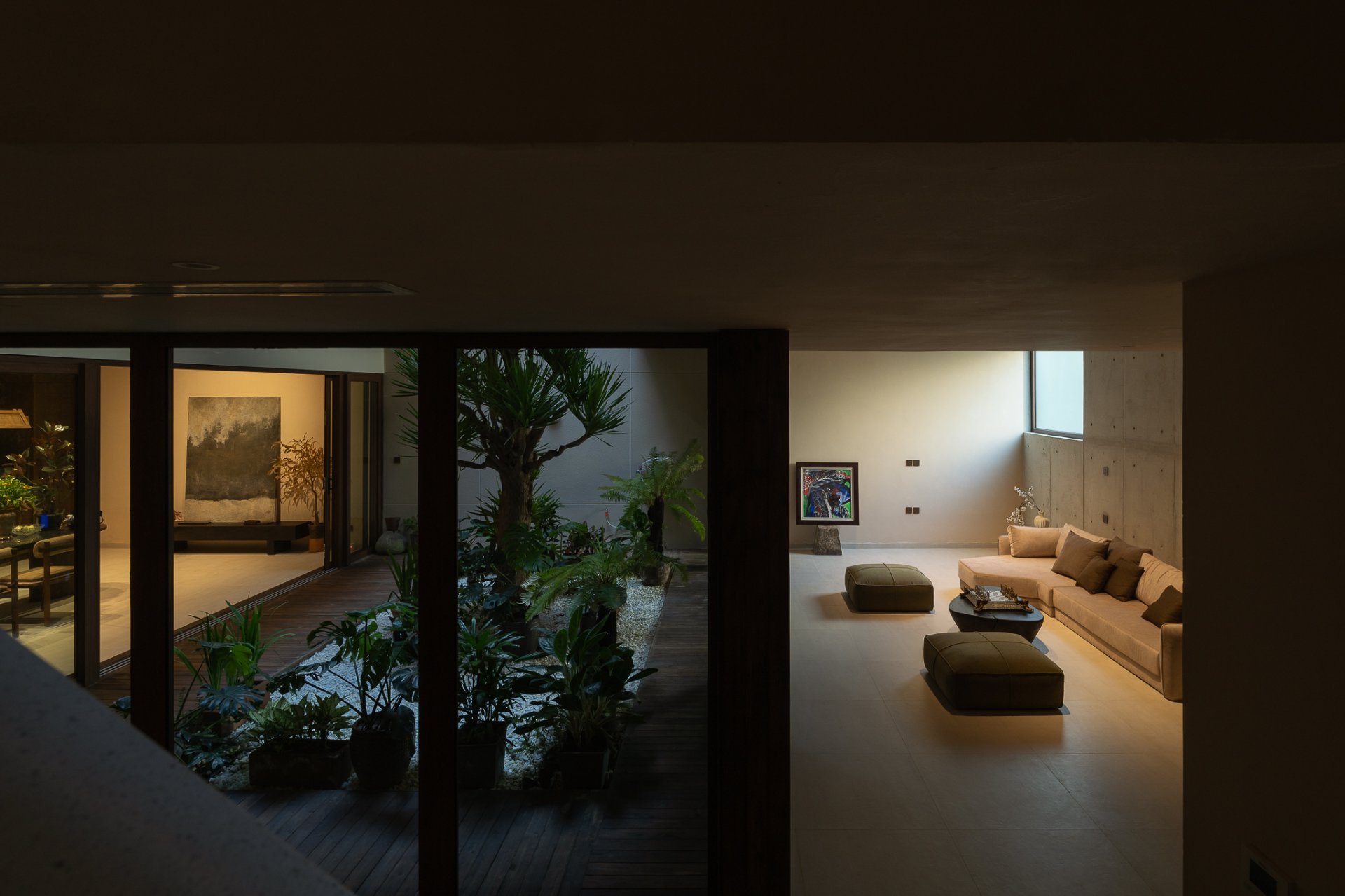 Cấu trúc của ngôi nhà được thiết kế với các lớp vỏ bọc chức năng và giếng trời, giúp cân bằng ánh sáng, thông gió và tạo ra sự liên kết giữa các không gian. Ánh sáng tự nhiên và hệ thống đèn của LYK phối hợp hài hòa, mang đến một môi trường sống đầy đủ ánh sáng nhưng vẫn đảm bảo sự riêng tư cần thiết.