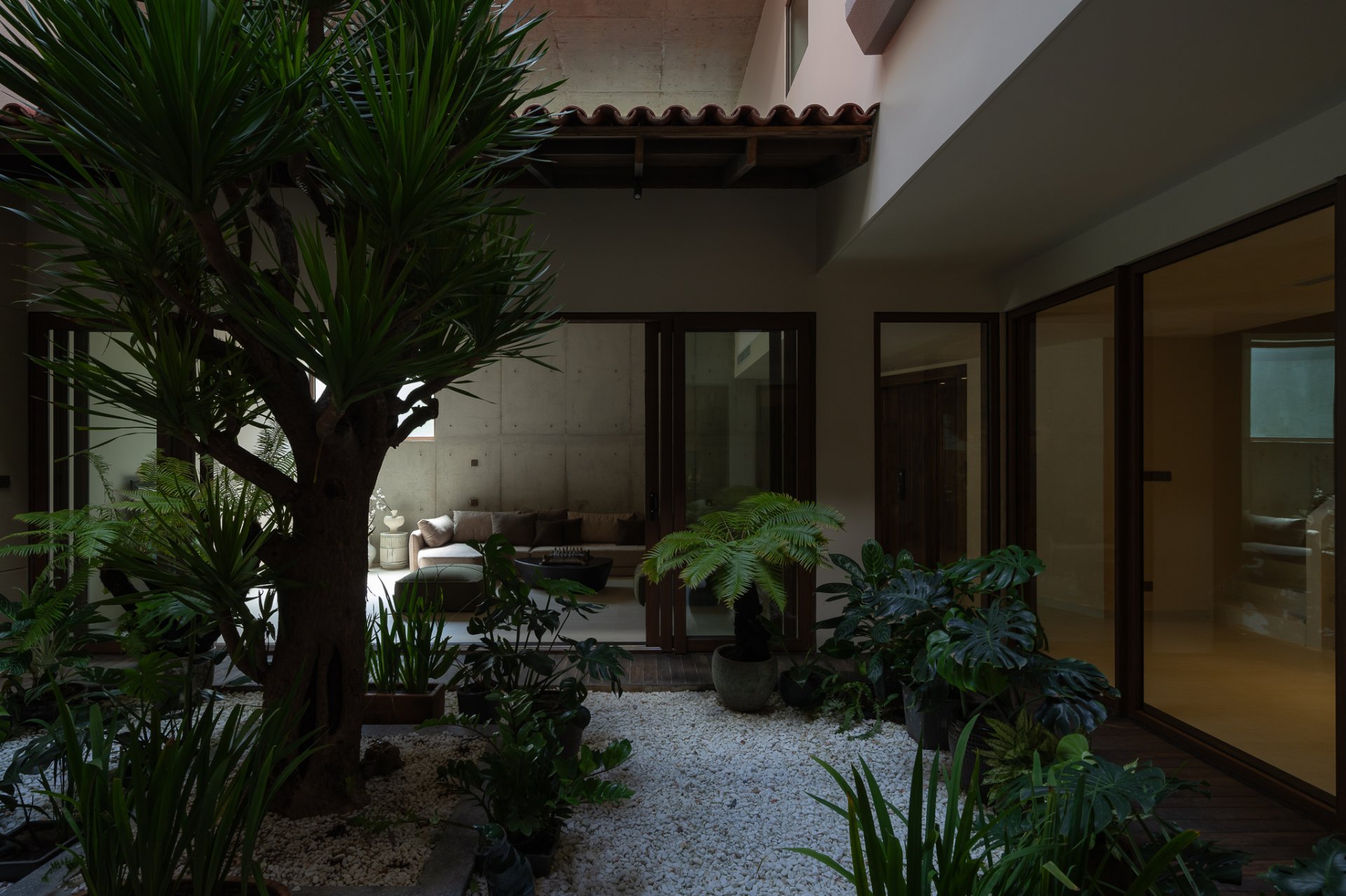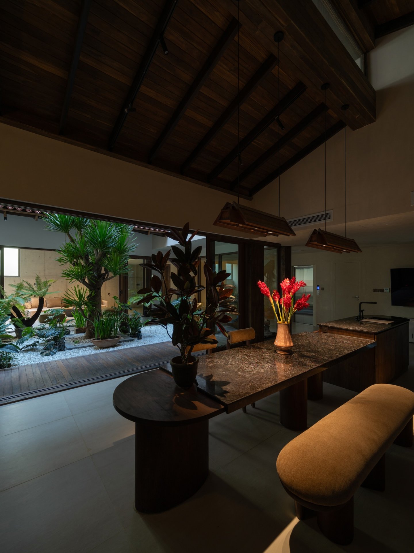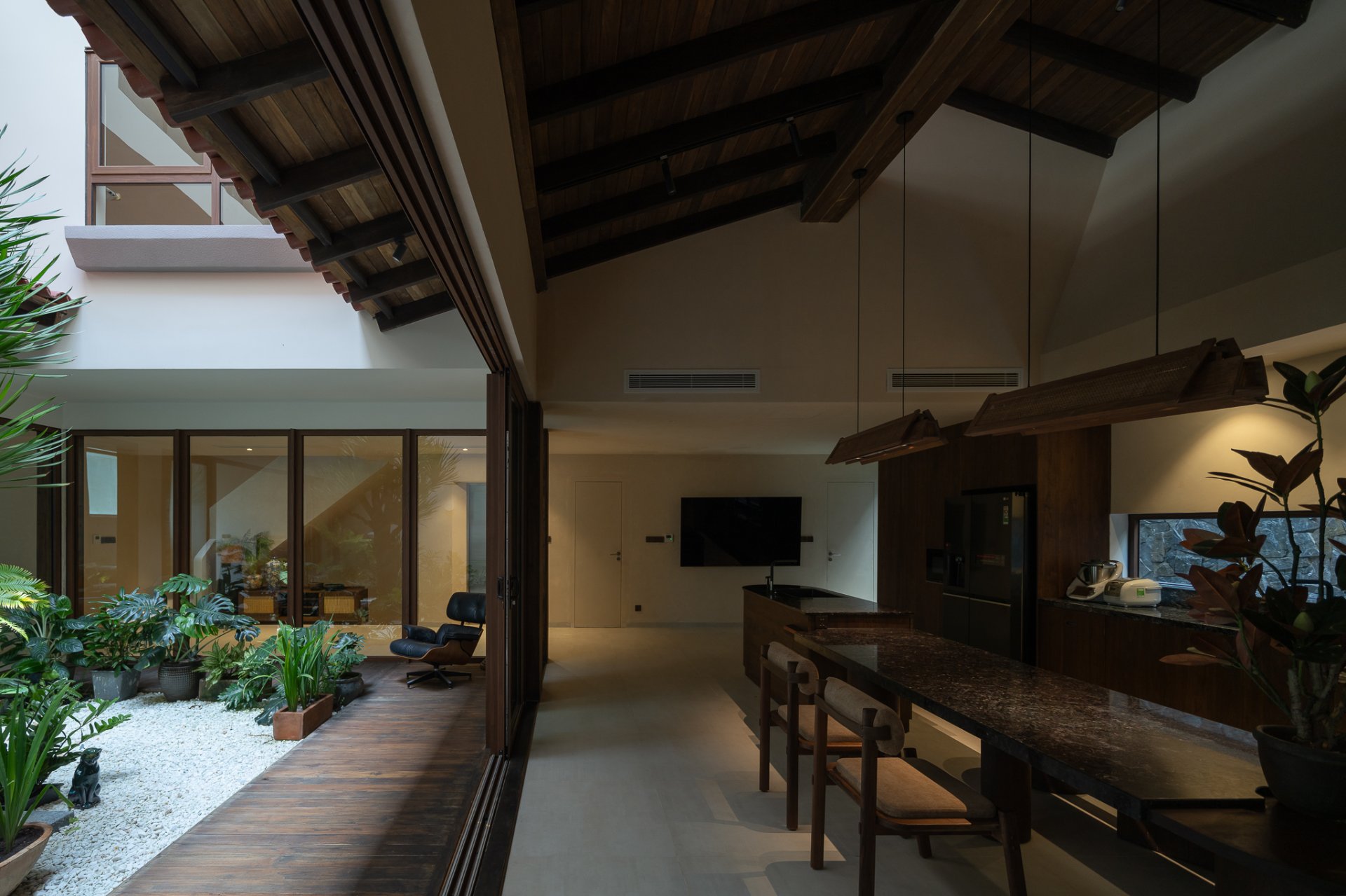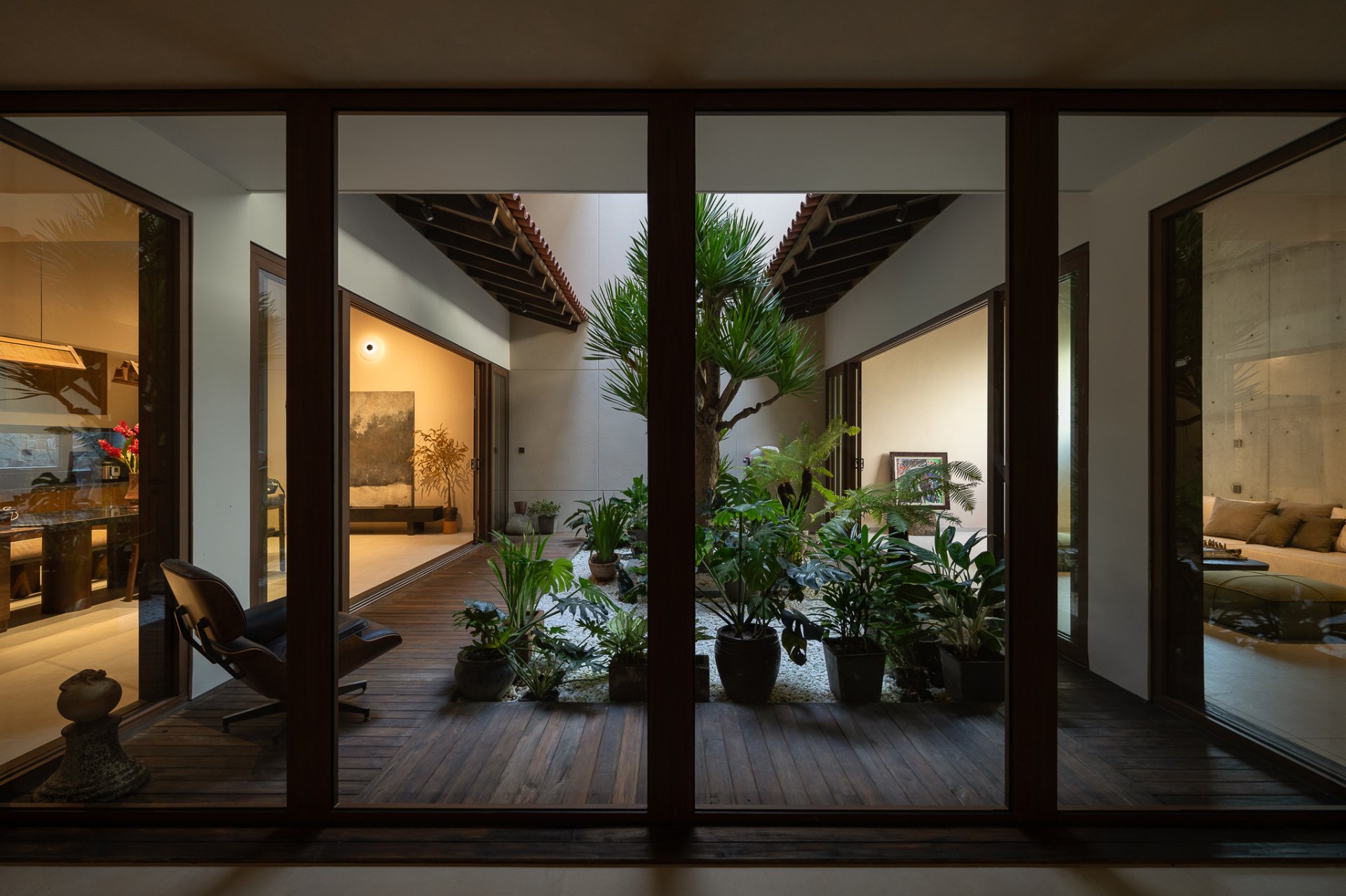 Cấu trúc của ngôi nhà được thiết kế với các lớp vỏ bọc chức năng và giếng trời, giúp cân bằng ánh sáng, thông gió và tạo ra sự liên kết giữa các không gian. Ánh sáng tự nhiên và hệ thống đèn của LYK phối hợp hài hòa, mang đến một môi trường sống đầy đủ ánh sáng nhưng vẫn đảm bảo sự riêng tư cần thiết.