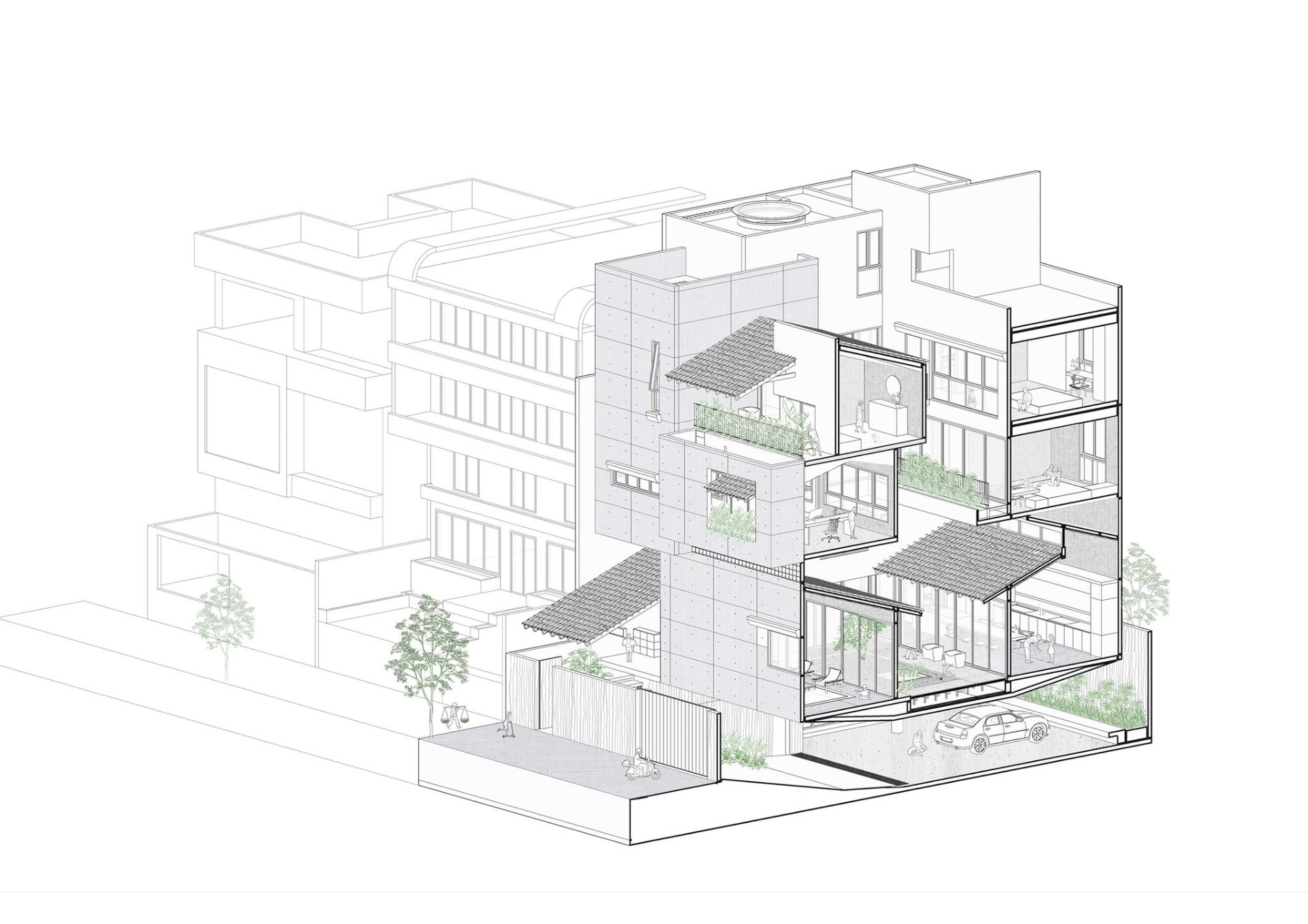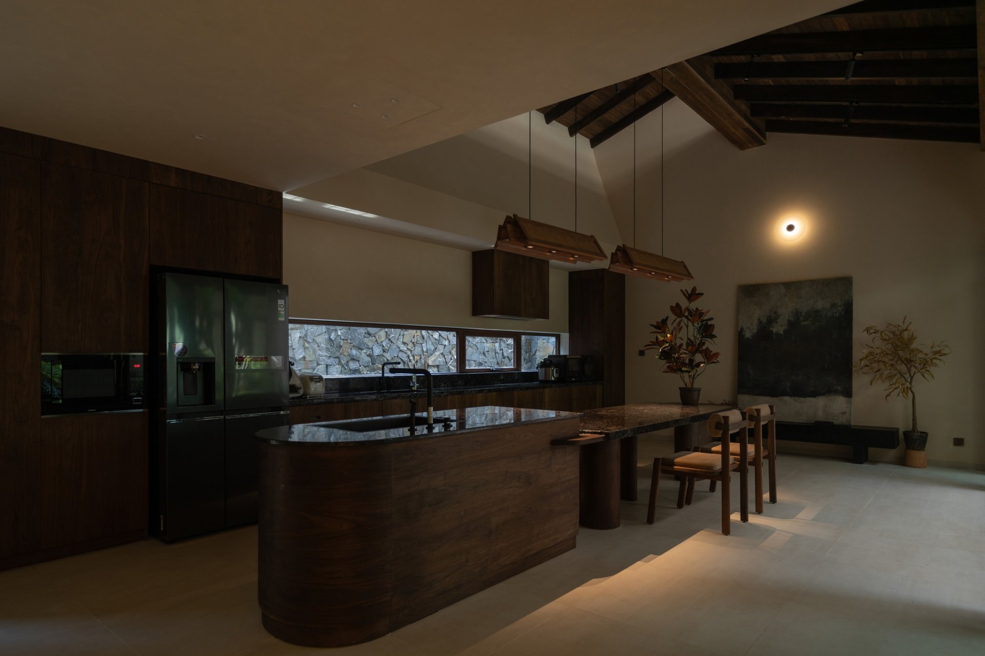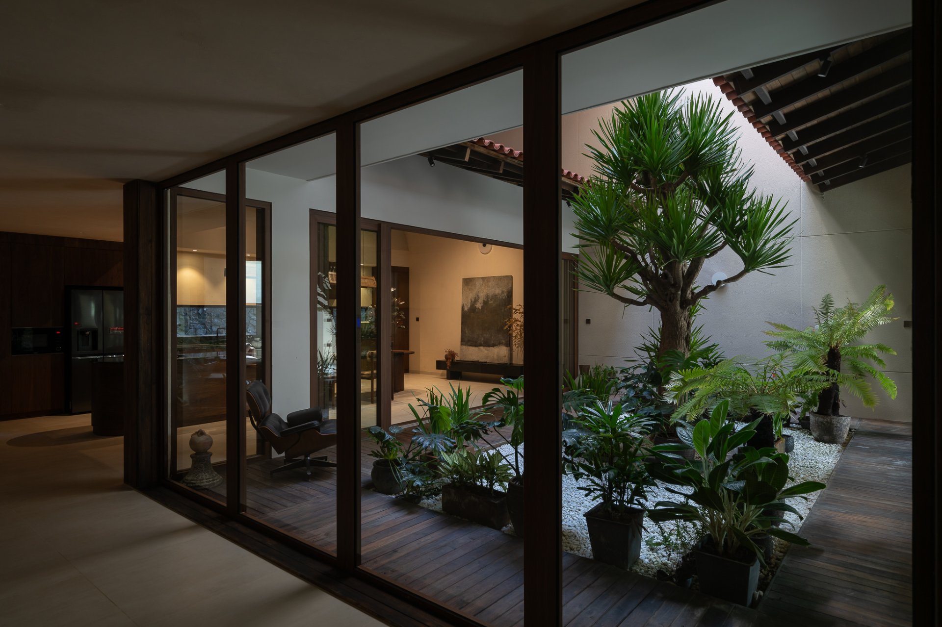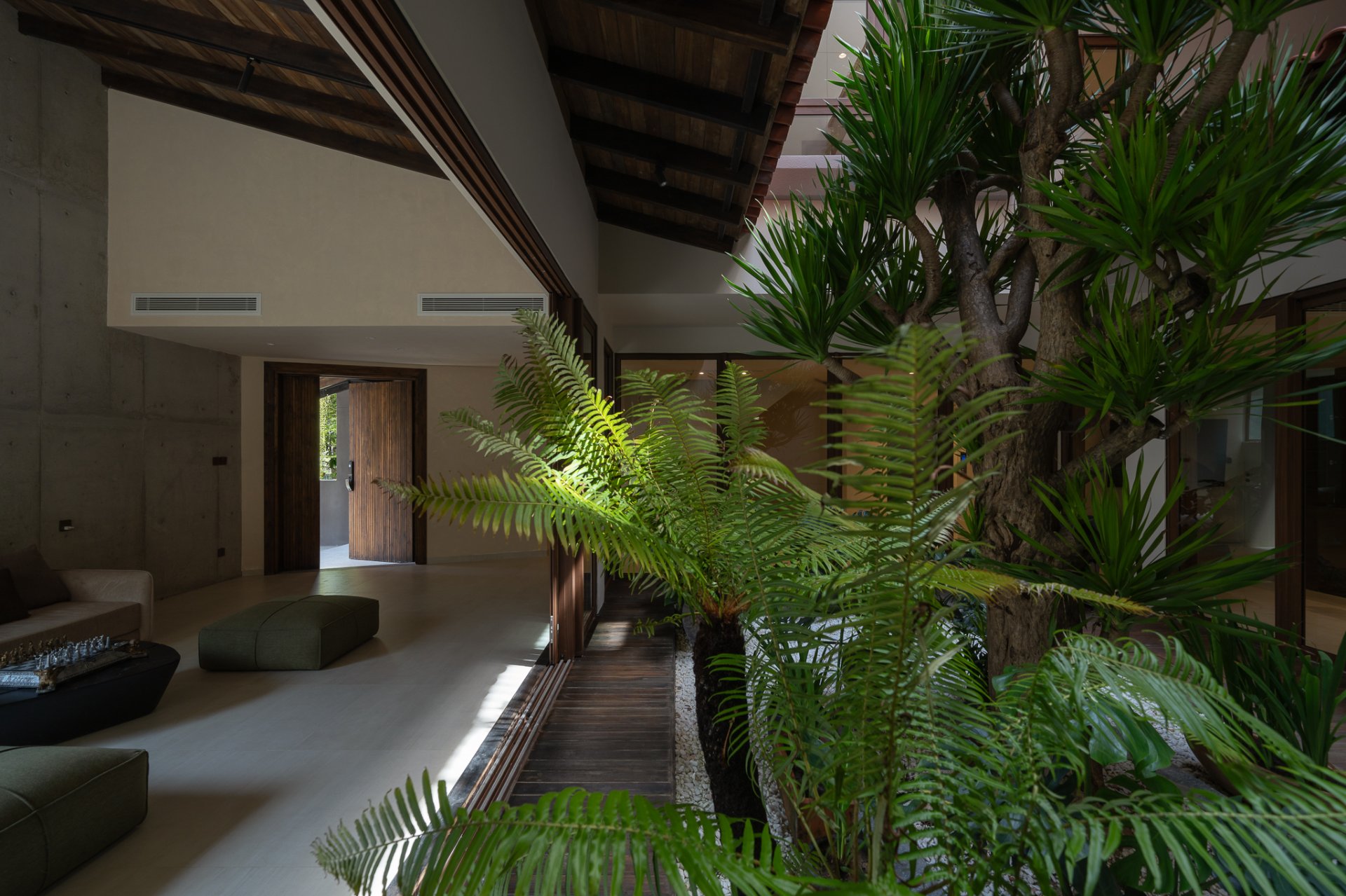 Cấu trúc của ngôi nhà được thiết kế với các lớp vỏ bọc chức năng và giếng trời, giúp cân bằng ánh sáng, thông gió và tạo ra sự liên kết giữa các không gian. Ánh sáng tự nhiên và hệ thống đèn của LYK phối hợp hài hòa, mang đến một môi trường sống đầy đủ ánh sáng nhưng vẫn đảm bảo sự riêng tư cần thiết.