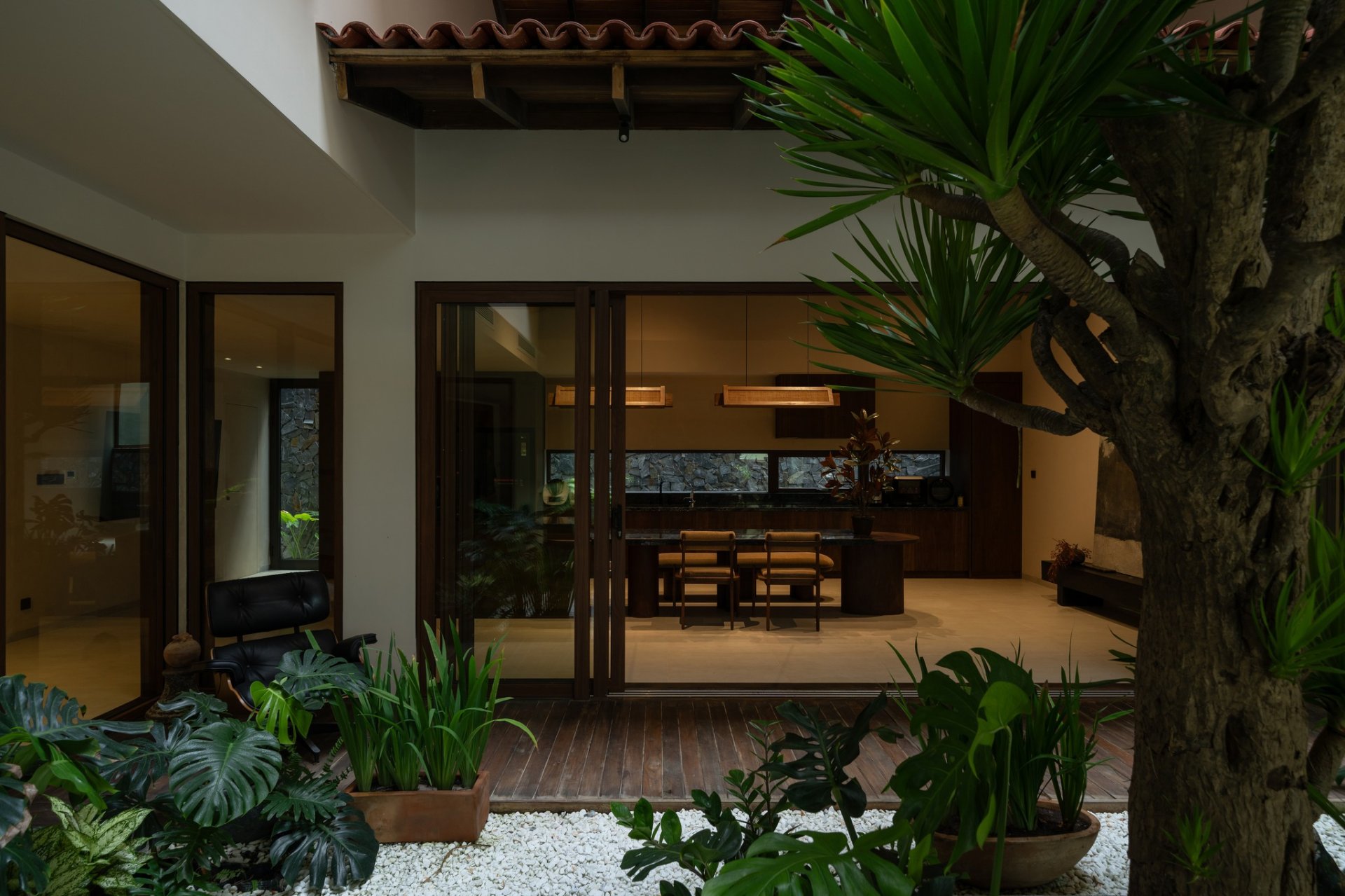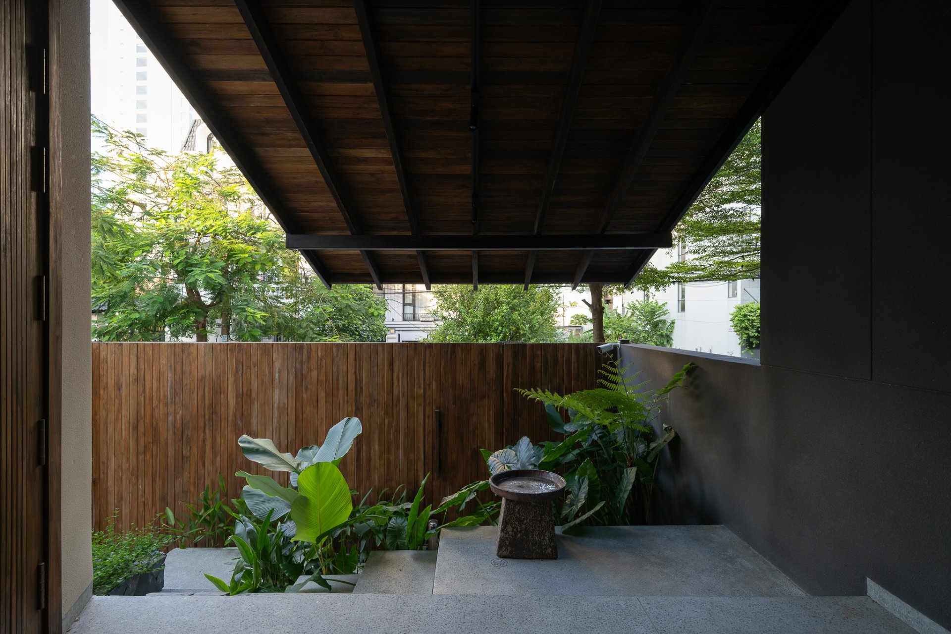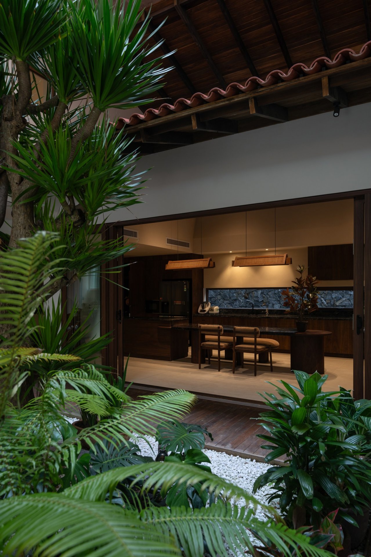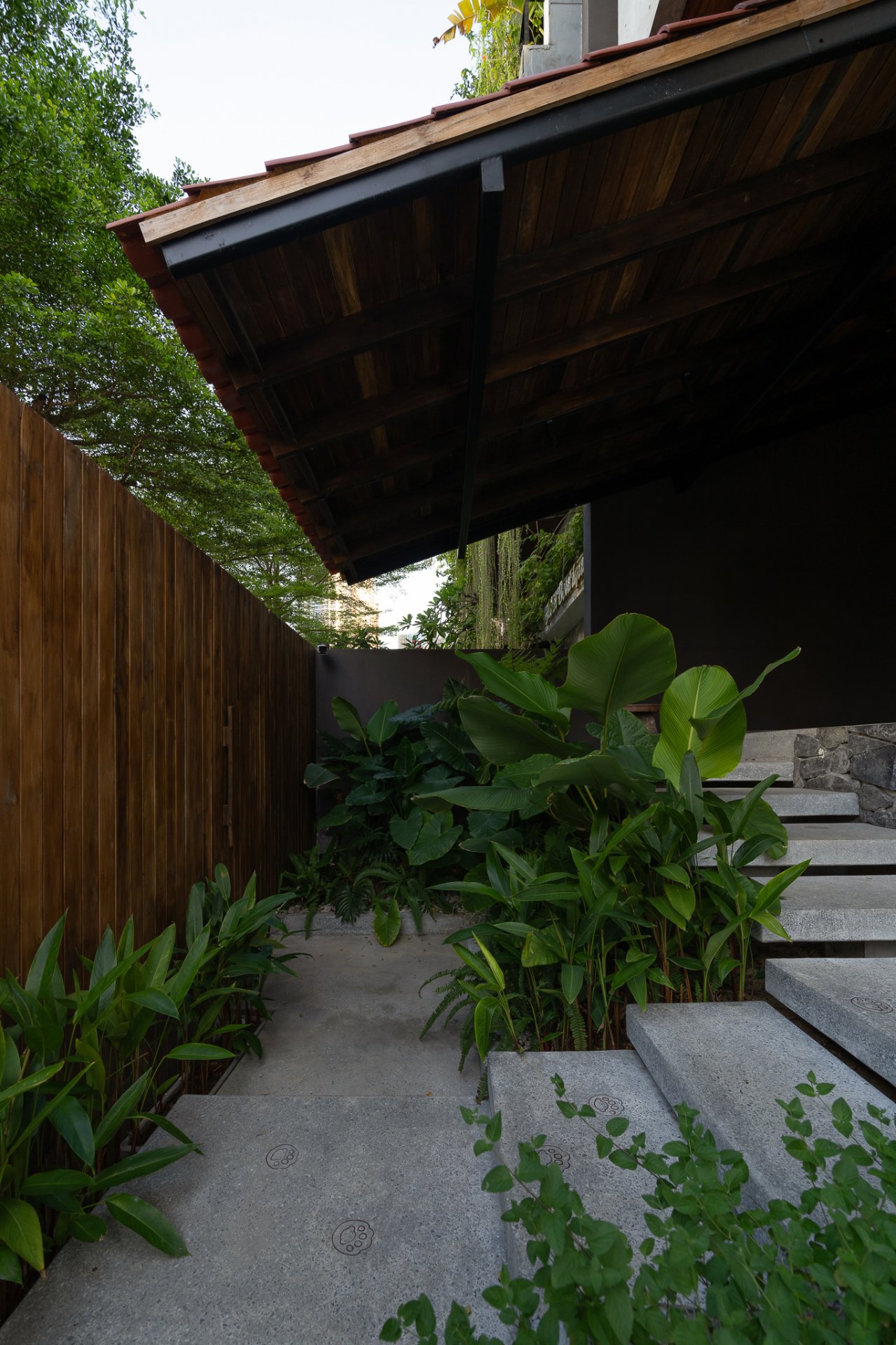 AD9 Architects cũng đã kết hợp rất tinh tế giữa các mảng bê tông thô theo phương đứng và hệ mái với cấu trúc vì kèo gỗ lợp ngói không chỉ giúp che chắn mà còn tạo nên sự hòa quyện giữa kiến trúc hiện đại và truyền thống. Đây chính là biểu hiện mạnh mẽ cho sự hài hòa và cân đối trong thiết kế kiến trúc, giúp không gian sống thêm phần ấm cúng, sum họp và hạnh phúc dưới Nục Viên.