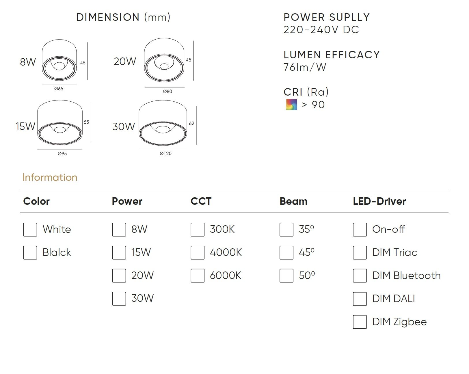 Công suất: 8W / 15W / 20W / 30W – 220-240V DC