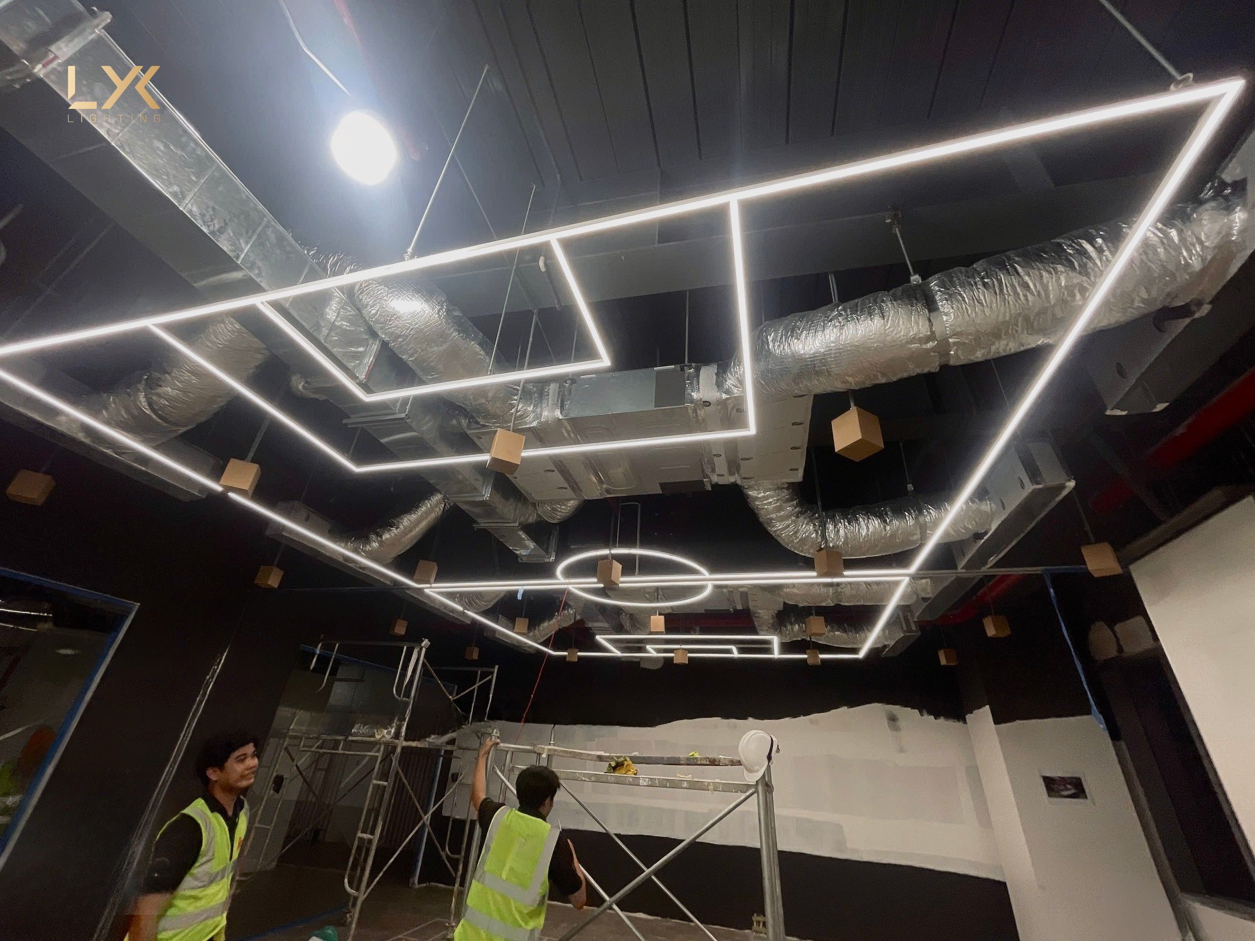 Nhưng thế vẫn chưa đủ. Để biến không gian trở nên khác biệt, chúng tôi đã đề xuất một điểm nhấn đặc biệt: Khung silicon tạo hình sân bóng đá với kích thước L1000W16H16mm, làm từ silicon uốn dẻo chống ăn mòn và ố màu. Hệ thống này giúp ánh sáng không chỉ chiếu sáng mà còn kể một câu chuyện – câu chuyện về sáng tạo, linh hoạt và sự kết nối.
